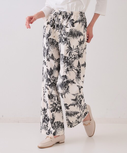 春夏らしいボタニカル柄が素敵な軽やかイージーパンツ【デザイン】・タウン使いはもちろんリゾートにもマッチするモノトーンボタニカル柄のイージーパンツです。・センタープレスも入っているので、すっきりとしたラインのきれいめな印象に。・ウエストはゴム仕様のイージーで快適な穿き心地です。・モノトーン使いの大人っぽい柄は、華やかさがありながらもスタイリングのしやすさ◎※ポケット数:横×2【素材】・麻調の軽やかで清涼感のあるポリエステル素材を使用。・モノトーンで着やすいオリジナルボタニカル柄をプリントしました。・マシンウォッシャブル機能素材でご家庭でお手入れが簡単です。※裏地なし※こちらの商品はやや透け感があるため、インナーの着用をおすすめします。※照明の関係により、実際よりも色味が違って見える場合があります。また、パソコン・スマートフォンなどの環境により、若干製品と画像のカラーが異なる場合もございます。モデル情報:身長165cm B72 W57 H84 着用サイズ:38(M)店舗へのお問い合わせ商品番号:637-62028●製品寸法:38(M):W~74cm H94cm 股下65cm 前股上32cm 渡り幅32cm 裾幅20cm40(L):W~75cm H96cm 股下66cm 前股上32cm 渡り幅33cm 裾幅20cm42(LL):W~76cm H98cm 股下67cm 前股上33cm 渡り幅34cm 裾幅21cm備考: