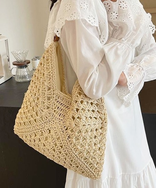 【大人かわいいクロシェバッグ】 大人気、クロシェ編みトライアングルトートバッグ/サマーバッグ/かごバッグ。 軽やかなペーパー素材を編み込み、春夏シーズンに取り入れたいおしゃれなトートバッグに♪ 500mlペットボトルや折り畳み傘、ハンディファン、ポーチ、財布などもしっかり入るちょうどいい容量◎ きれいめワンピースやカジュアルなデニムコーデなど、どんな服にも合わせやすい上品なアイテムに仕上げました。 [仕様] ・メイン口:マグネットボタン開閉 ・内側:小物ポケット×1 ・裏地付き [サイズ/重さ] 高さ16cm/下横幅37cm/厚み3cm/持ち手高さ34cm 200g [素材] ペーパー/PU おすすめのシーン 通勤 オフィス 通学 デート ディナー オケージョン フォーマル サブバッグ、旅行、レジャーなど幅広くお使いいただけます。 クリスマスやお誕生日などのプレゼントやギフトなどにも最適な仕上がりです。 ▼ブランド 【florge】 -フロージュ- 「着る人の心や体を癒し包む服、何気ない日常をちょっとだけ特別な日に変えられるアクセサリー」をテーマに、おしゃれでかわいい商品からおとなめオフィスに使える商品までトレンドの人気アイテムをご提案するレディースブランドです。 プチプラ商品を多く取り扱っているのも嬉しいポイント♪ 画像付近のブランド名からぜひご覧ください。