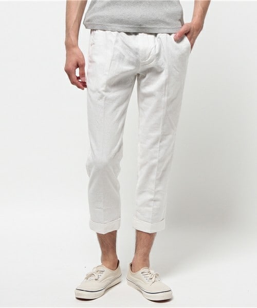 【メッシュベルト付コットンリネンクロップドパンツ】 リネン特有の清涼感と肌触りにコットンのしっかりとした生地感が加わった7分丈クロップドパンツです。 脚の形にフィットするので、見た目とシルエットを綺麗に見せてくれます。 自分のウエストに合うところで留められるメッシュベルトも付いているので、ストレスフリーで着用頂けます。 夏のスタイリングに大活躍してくれるコストパフォーマンスの高いアイテムです。