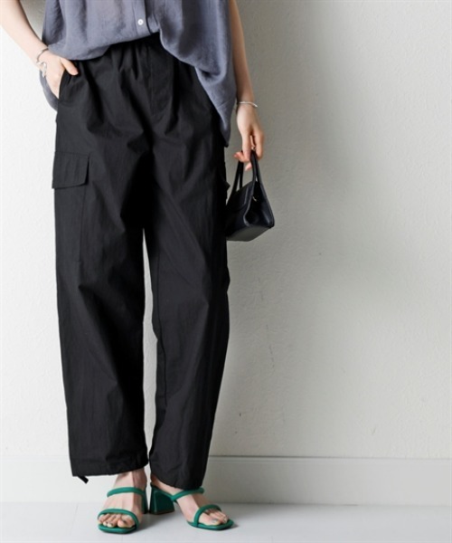 コーデに投入するだけでトレンド感を発揮するカーゴパンツ。コットンの柔らかさとナイロンの軽さや強度を持ったコットンナイロン素材でほどよいボリューム感に仕上げました ■デザイン 軽くてやわらかいパラシュートカーゴパンツ。 ルーズなシルエットでリラックス感のある穿き心地です。 裾紐は外に見えにくい仕様で更に足首をすっきりと見せ、美脚効果も抜群。 カーゴパンツのディテールを取り入れたデザインで、機能性も兼ね備えています。 ■素材 軽くて柔らかい綿ナイロン生地を使用。 ■おすすめのスタイリング どんなトップスとも合わせやすく、裾紐でシルエットを調節できるので、様々な着こなしが楽しめます。 この夏、大活躍間違いなしのアイテムです。 <仕様> 綿70%・ナイロン30% <洗濯方法> 洗濯機OK ネット使用 ■キーワード 夏、秋、パンツ、カーゴパンツ、リラックス感、カジュアル、カジュアルパンツ、ミリタリー、通年、オールシーズン、着回し、20代、30代、40代、ナイロン素材、カラーパンツ、ピンク、グリーン、ブラック、日常使い、きれい目カジュアル、洗える、洗える素材、ナイロン、おしゃれ、トレンド、