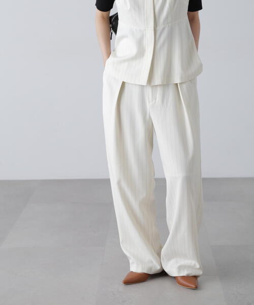 中心にかけて太幅タックを入れたデザインパンツ。股下を少し長く設定したセミワイドシルエットです。 スニーカーと合わせて裾を少しバウンドさせたり、通勤シーンではヒール合わでちょうどよい丈感になります。 同シリーズの(ペプラムキャミソールビスチェ・店舗商品番131-511025)とのスタイリングがおススメ。 フラットな目面のポリエステルレーヨン生地を使用しています。 ------------------------------------------------------ ◆商品のお気に入り登録◆ お気に入りアイテムの値下げ・再入荷・在庫1点などの通知を受け取ることができます。 ◆ブランドのお気に入り登録◆ 新商品や再入荷、セール、クーポン配布などお得な情報を受け取ることができます。 ------------------------------------------------------ ※モデルの着用画像の場合、光の当たり具合により、実際の色味と異なって見えることがございます。 色味は、商品単体の画像をご参照ください。