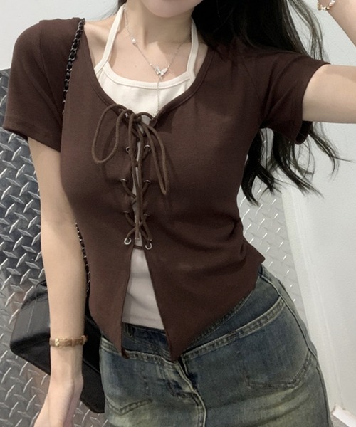 【SpRay レ-スアップフェイクレイヤ-ドトップス】 スピンドルカーディガンに ホルターネックキャミソールを重ね着している かの様なフェイクレイヤードアイテム。 1枚でレディライクなカジュアルスタイルが 完成します♪ ぴたっとタイトなシルエットと程良い丈感が どんなコーデにも合わせやすく、 バランスも取りやすいアイテムです◎ 首元すっきりのフェイクレイヤードトップス。 ワンアイテムでオトナガーリーなスタイリングが叶います! 可愛らしさとカジュアルさ兼ね備えた 着回ししやすいアイテムです。 シンプルでどんなアイテムとも合わせやすく、 忙しい朝もコーデに悩む心配がありません。 着心地も良く、楽なのでルームウエアとしても使いやすいです。 Styling シンプルにフレアデニムやワイドパンツなど こなれ感漂うスタイルはもちろん、 ミニスカートでアーリースタイルや ティアードフリルスカートで人気の バレエコアスタイルにもおすすめです。 付属のヒモ部分は、色落ちしやすいので 他の物と分けて洗ってください。 濡れたまま放置すると、色落ちや色移りの 原因になりますので、ご注意下さい。 #レディース #トップス #カットソー #フェイクレイヤード #スピンドリル #アーリースタイル #バレエコア #韓国風 【素材感】 柔らかく肌触りの良い生地。 ※詳しいお手入れ方法は商品タグをご参照ください。 ◆伸縮性 有り ◆透け感 無し ◆裏地 無し 【商品のお気に入り登録】 完売カラーの再入荷通知やラスト1点の通知 プライスダウンの通知も受け取ることができます。 ぜひご登録ください◎ 【ブランドのお気に入り登録】 新商品や再入荷など、 いち早く情報を受け取ることが出来ます。 ※輸送時による、多少の汚れ・シワがある場合がございます。 ※撮影時のライティング、ご覧になっているモニター・PC環境により実際の商品と色味が異なって見える場合がございます。ご了承の上お買い求め下さい。