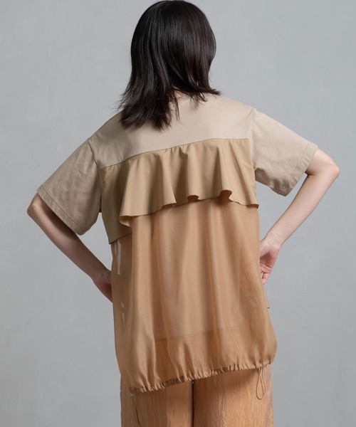■2025 SPRING SUMMER collection■ 3種類の素材をジョイントしたデザイントップス アシンメトリーなペプラムデザインが目を惹くアイテム 異素材ミックスと立体感のあるデザインが特徴的なトップスです。 身頃は天竺、ペプラム部分がタフタ、後身頃のふらし部分がオーガンジー素材を使用し、カジュアルさとフェミニンさを絶妙にミックス。 前面の二段フリルがボリューム感を演出し、動きのあるシルエットに。視線を下に引き、体型カバーにも◎ 背面はシアーな透け感素材を使用し、軽やかさと抜け感をプラス。裾のドローストリングでシルエット調整も可能です。 一枚で主役になれる存在感があり、シンプルなボトムスと合わせるだけでスタイリングが完成します。 【DESIGN】 ■衿ぐりはモード感のある開きが少なめのクルーネック ■前身頃は2段フリル、後身頃はフリルとシアー素材のふらしの組み合わせ ■前後差のある丈感 ■1枚でも存在感もあり、リラックス感のあるサイズスペック 【MATERIAL】 (表地) 40/2の糸で編立てたクラシック天竺コットンを使用 ・ソフトな仕上がりの柔らかな肌触り ・着心地が良く、吸汗性に優れています (別地) 天然素材の様な薄手タフタを使用 ・さらっとやわらかな風合いが特徴 ・撥水性・透湿性に優れた素材 (別地) 微光沢のオーガンジーを使用 ・シャリ感のある軽やかな素材 ・ソフトな表情も特徴的 ・独特な表面感が上品な印象 -------------------------- 裏地:なし 光沢感:微光沢あり 透け感:なし 伸縮性:あり 生地の厚さ:中肉厚 ケア方法:ホームクリーニング(手洗い) -------------------------- ◆お取り扱いについては商品についております品質表示にてご確認下さい。 *光のあたり具合いやパソコンなどのモニター環境によって実際の色味と異なって見える場合がございます。予めご了承ください。 *撮影時はサンプルの為、若干のデザイン変更等ある場合がございます。予めご了承ください。 <INFORMATION> ◆商品のお気に入り登録お気に入り登録していただいた商品は、完売商品の再入荷通知やラスト1点の通知、またクーポン発行やタイムセールの通知もお届け!ぜひご登録してください。 ◆ショップ・ブランドのお気に入り登録新商品や再入荷、ショップ・ブランドのお得な情報をいち早お届け!ぜひご登録してください。