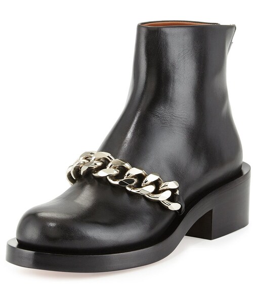 Givenchy calf leather ankle boot. 4.5"H shaft; 10" circumference. Approx. 2" flat stacked heel. Silvertone curb chain across instep. Back zip for ease of dress. Leather lining and sole. Made in Italy.