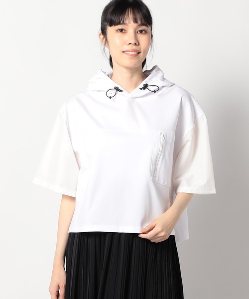 圧縮カノコ ショートワイドパーカーボディには吸水速乾性とストレッチの入った 着やすい「圧縮カノコ」、袖には通気性のある「ポイントメッシュ」素材がドッキングデザインされた、ショートワイドパーカーです。胸にZIPのついたパッチポケットが配置されてデザインポイントになっています。近年の蒸し暑さに対応できるよう、さらりとした着心地にこだわった素材を使っています。■pointボディに使われている【圧縮マイクロカノコ素材】は…スポーツブランドでも採用されている吸水速乾機能のある素材を使用しています。ポロシャツで馴染みのある鹿の子素材を細かく圧縮する事で、ニットのような伸縮性とカットソー素材には出せない滑らかな肌触りに仕上がっています。■detail*ストレッチ・吸水速乾メリットタグ付き*ZIP付き胸ポケットあり*両袖部分は布帛の切り替えデザイン■fabric……………………透け感:白あり裏地:なし伸縮性:あり(袖布帛生地は伸縮なし)光沢感:なし洗濯方法:洗濯機洗い可能……………………※詳しいお手入れ方法は商品タグをご参照ください■coordinate*ワイドボトムやスカートなどもバランス良くコーディネート出来ます。*袖のレイヤードやカラーインナーなどのレイヤードを楽しめます。