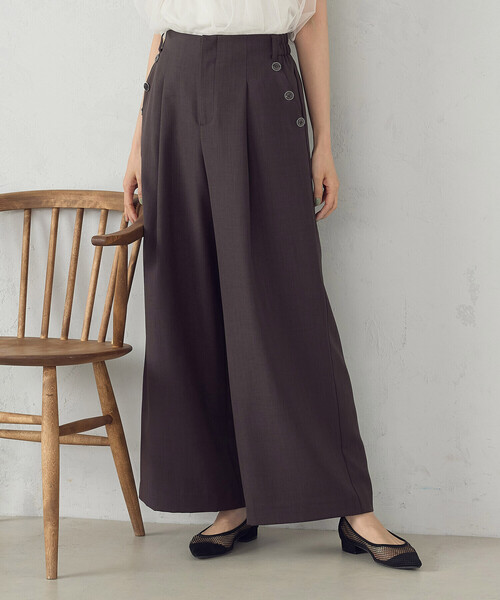 \さらりと心地よく、大人に似合う夏ボトム/《デザイン》セミワイドシルエットのマリンパンツです。前はウエストベルトレス、後ろはゴム仕様にしリラックス感のある穿き心地に仕上げました。前のポケットには、貝調ボタンのふちにメタル素材を使用したデザイン性のある飾りボタンでキレイめな印象に仕上げています。ボタンのポイントがあるので、単品のコーディネートでもサマになる夏の便利ボトムです。《素材》ポリエステル100%の麻調素材です。程よい張り感で美しいシルエットをかたちづくります。ドライタッチで肌離れがよく、初夏に最適な素材感。ストレッチ性があるため、リラックス感のある穿き心地です。……………………透け感:なし厚さ:中肉伸縮性:なしポケット:あり裏地:なし洗濯方法:洗濯機可……………………※画像の商品はサンプルとなりますので実際の商品と仕様、加工、サイズが若干異なる場合がございます。※こちらの商品はFIVE FOXes独自の採寸方法となっています。本サイトのサイズガイドと採寸方法が異なる場合がありますのでご了承ください。