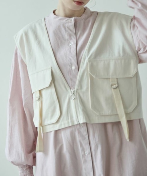 【コンパクトサイズのミリタリーショートベスト】 ・ポケット口にベルトが付いたミリタリーポケット ・大きく開いたバックのVネックは同生地のベルトがさりげないポイント ・トレンド感のあるショート丈とゆったりとした身幅でリラクシーな着心地 ・フロントジップの金具はリング型になっており、細かい部分まで抜かりないデザイン ・ナチュラルな風合いのコットン生地 ~スタイリング~ Tシャツをインナーにカジュアルに着こなすのはもちろん、 フェミニンなレースアイテムやワンピースを合わせてカジュアルダウンアイテムにするのも◎ いつものコーデにプラスするだけで目を惹きポイントになる1枚です。 - - - - - - - - - - - - - - - - - - - - - - - - - - - - - - - - - 透け感:なし 裏地:なし 伸縮性:なし 光沢感:なし ポケット:あり 洗濯: c2R3420 - - - - - - - - - - - - - - - - - - - - - - - - - - - - - - - - - ※ポケットリボンは強く引っ張ると外れやすい為、ご注意ください。 ※着用、お取り扱いの際は、商品についている品質表示とアテンションタグを必ずご確認下さい。