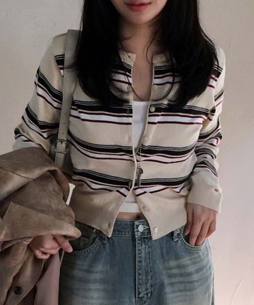 シンプルなコーデに映える一枚。こなれ感のあるスタイルを楽しめるトレンドアイテム! ■デザイン ・ランダムなマルチボーダー柄が印象的なカジュアルデザイン。 ・程よいフィット感で、すっきりとしたシルエットを演出。 ・Vネックデザインで首元をきれいに見せ、抜け感のある着こなしに。 ・コンパクトな着丈で、ハイウエストボトムとも相性抜群。 ・フロントボタン仕様で、開けても閉めてもこなれた雰囲気に。 ■素材 ・柔らかく伸縮性のあるニット素材で快適な着心地。 ・程よい厚みでロングシーズン活躍。 ・さらっとした肌触りで、軽やかに羽織れる一枚。 ■スタイリング ・キャミソールやタンクトップの上に羽織って、軽やかなレイヤードコーデに。 ・デニムやワイドパンツと合わせて、大人カジュアルなスタイルに。 ・ショートパンツやバルーンスカートなど、ガーリーカジュアルな着こなしも。 ・フロントボタンを閉じて、トップス風に着こなすのもおすすめ。 ・秋冬はコートを上から羽織って、ちらっとボーダーを覗かせるのも可愛い。 ----------------------------- 透け感:なし 伸縮性:あり 裏地:なし ------------------------------ ------------------------------ 【スタッフが着用しました!】 身長:158cm 普段着用サイズ:S~Mサイズ 今回着用サイズ:FREEサイズ ・着用感 程よくゆとりはあり、ちょうど良いサイズ感です。 ベーシックなシルエットなので、さらっと羽織るのにも万能。 明るいマルチカラーデザインで、コートの中に着ても、コーデのアクセントに◎ ------------------------------------------------ 【お買い物をよりお楽しみいただく為に】 ▼お気に入り登録 サイズ・カラーを指定して、♡マークをクリック![セール通知・ラスト1点の通知・完売アイテムの再入荷通知]を受け取ることができます。 ▼ブランドのお気に入り登録 新商品や再入荷、タイムセールやクーポン等いち早くブランドのお得な情報を受け取ることができます。