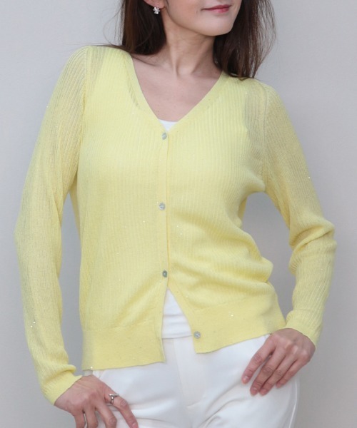 シアー感のあるミドルゲージリブニットカーディガン。ベーシックなデザインと細すぎないサイジングが羽織として重宝します。ささやかに散りばめられた小さなスパンコールが上品に輝き、目立ちすぎず、普段のワードローブに馴染みます。持ち運びもしやすく夏の冷房対策にはもちろんTシャツや開襟シャツに肩掛けすればこなれた雰囲気に。シェルボタンが涼やかなアクセント。差し色になるレモンイエローやデイリーに使えるベージュがラインナップ。同素材でトップスも展開しており、ミントとブラックはアンサンブル着用が可能です。※発送上の状態によって商品がシワになる場合がございます。※商品により色落ち・色移りがある場合がございますので、品質表示をご確認の上、お取り扱いにご注意くださいませ。==============================今季より事業変更のため、ショップ名が「DURAS ambient」から「AMBIENT」へ変更となります。それに伴い、商品タグが「DURAS ambient」と「AMBIENT」で混在している可能性がございますので、予めご理解とご了承の程よろしくお願い致します。なお、ショップ名は変更となりますがブランドコンセプトはこれまでと変わらず、更なる発展に努めて参りますので、今後とも変わらぬご愛顧のほどよろしくお願い申し上げます。==============================