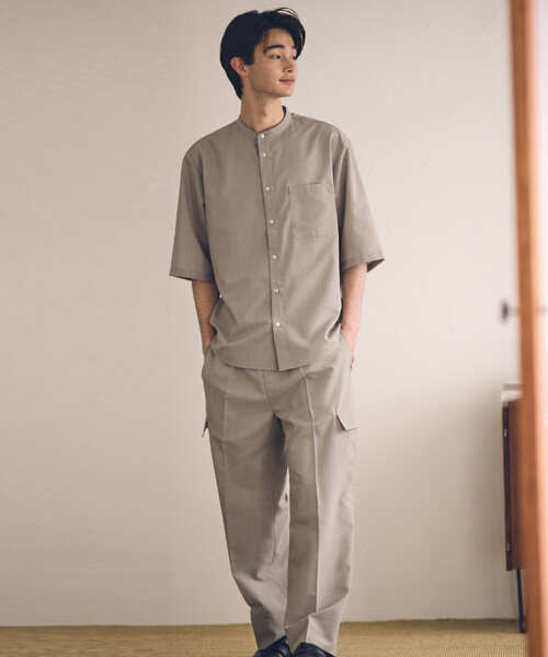 《デザイン》5分袖のバンドカラーシャツです。シルエットは程よくゆとりを持たせたリラックスシルエットです。衿部分は窮屈にならないよう、着用時に首から少し離れるようなパターンにしています。また着丈を少し短くしてすっきりさせました。5分袖のため、夏から秋まで長時間お使いいただけます。また首周りがすっきりしているので、さまざまなアイテムとのレイヤードがしやすいデザインです。《素材》まるで麻のようなナチュラルな生地感のポリエステル素材です。吸水速乾機能を持った素材で、爽やかな肌触りが得られます。ドライタッチな風合いで、通気性にも優れ清涼感があり、快適な着心地です。イージーケア性にも優れ、シワにもなりにくく、ご家庭でのお洗濯が可能なお手入れしやすい素材です。《セットアップ》同素材展開のパンツ(47-55PK17-205)とセットアップとしても着用可能です。※在庫がない場合もございますので、予めご了承くださいませ。《取り扱い注意》洗濯機洗いは必ずネットを使用し、弱洗いもしくは石油系ドライクリーニングして下さい。アイロンは必ずあて布を使用して下さい。この製品は素材の特性上、汗や雨等で濡れた時、強く擦られた場合、多少の色落ち、色移りする事がありますので、お取り扱いには十分ご注意下さい。 ……………………透け感:なし厚さ:ふつう伸縮性:なし光沢感:なし裏地:なし洗濯方法:洗濯機洗い可……………………※画像の商品はサンプルとなりますので実際の商品と仕様、加工、サイズが若干異なる場合がございます。※こちらの商品はFIVE FOXes独自の採寸方法となっています。本サイトのサイズガイドと採寸方法が異なる場合がありますのでご了承ください。