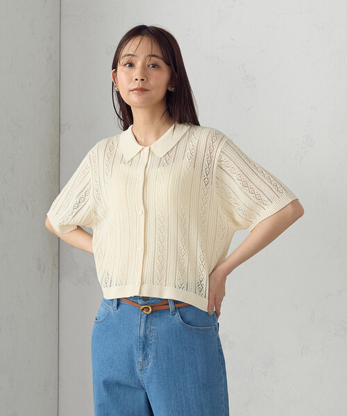 \着回しがきく、トレンドニット☆/ 《デザイン》 Tシャツやタンクトップの上にさらっと羽織るも良し、 ボタンを全部閉めてトップスとして着ることもできる一枚で 着回しできる夏らしい半袖ニットシャツです。 パンツとスカートどちらにも合う丈感です。 裾まですとんとしたボックスシルエットです。 程よくゆとりのあるサイズ感でさらっと羽織りやすいです。 綺麗めにもカジュアルにも着れる幾何学柄をMIXした透かし柄です。 暑い夏の時期に一枚で様になるオススメのニットです◎ 《素材》 夏に快適に着れるさらっとしたサマーニットです。 チクチクせず、肌にべたつかず着心地の良いニットです。 幾何学の透かし柄が涼し気な印象です。 汗をかいても洗濯機で洗えて取り扱いが楽ちんなのも嬉しいポイント♪ ………………………………………… 透け感:あり 厚さ:中肉 伸縮性:あり 洗濯方法:洗濯機(弱)可 ………………………………………… ■気になる商品はお気に入り登録をおススメ■ ▼商品のお気に入り登録 完売アイテムの再入荷通知、ラスト1点、またクーポンやお値下げ通知をお知らせします。 ▼ブランドのお気に入り登録 新作アイテムの入荷や人気アイテムの再入荷、タイムセールやクーポンなど、 いち早くブランドのお得な情報を受け取ることができます。 ※画像の商品はサンプルとなりますので実際の商品と仕様、加工、サイズが若干異なる場合がございます。 ※こちらの商品はFIVE FOXes独自の採寸方法となっています。 本サイトのサイズガイドと採寸方法が異なる場合がありますのでご了承ください。