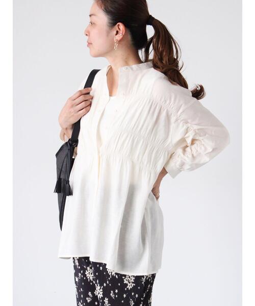 くしゅくしゅっとしたシャーリングが愛らしさをプラスするシャツ。シンプルなバンドカラーで首のラインや顔周りもすっきりとした印象にみせてくれます。レーヨン混素材の柔らかな風合いで着心地も良く、シーズンらしい軽やかなスタイリングが楽しめる1着です。※商品画像は、撮影環境やお客様のご利用のPC・スマートフォンのモニター環境などにより実物と色味に差異がある場合がございます。