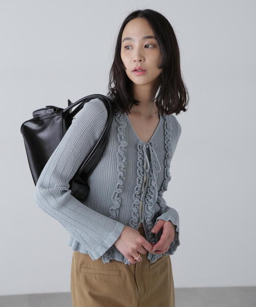 細番手のブークレ糸を使用したカジュアルな表情のニットカーディガンです。 アイレット柄をアクセントにしたリブ編みに映える、華やかな畦フリルがポイント。 フロントの細リボンとボタンを留めて1枚着としても羽織りとしても使えます。 裾は抜け感があるのでどんなボトムスにも合わせやすいデザイン。ワイドなデニムパンツやチノショートパンツとのコーディネートもおすすめです。 ※モデルの着用画像の場合、光の当たり具合により、実際の色味と異なって見えることがございます。色味は、商品単体の画像をご参照ください。 ------------------------------------------------------ ◆商品のお気に入り登録◆ お気に入りアイテムの値下げ・再入荷・在庫1点などの通知を受け取ることができます。 ◆ブランドのお気に入り登録◆ 新商品や再入荷、セール、クーポン配布などお得な情報を受け取ることができます。 ------------------------------------------------------