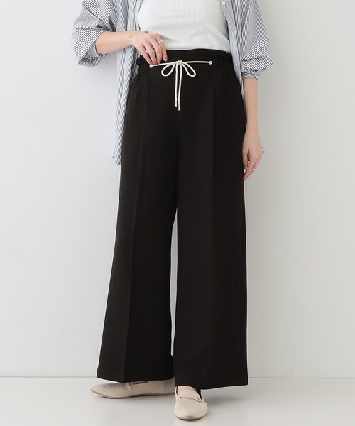 【デザイン】 ウエストのロープ紐がコーディネートのアクセントになったワイドパンツ。 ウエスト後ろ部分にはゴム仕様でギャザーが入っており、楽に脱着いただけます。 ストンとしたワイドシルエットにセンタープレス入りで、きれいに穿いていただける1枚です。 【スタイリング】 ロゴTシャツやボーダーのトップスと合わせたカジュアルなマリンスタイルがおすすめ。 襟付きシャツを羽織ればこなれ感のある着こなしに。 フェミニンなブラウスを合わせたキレイめコーデにもマッチします。 【お客様からいただいたコメント】 ・足が長く見えてスタイルが良く見えます! (身長:166cm 体型:やせ型 ブルーのMサイズ購入) ・サラッとしてて、着心地がいいです。 (身長:166cm 体型:普通 ブラックのLサイズ購入) とのお声を頂戴しております。 【素材】 サラッとした肌触りで、これからのシーズンに嬉しい素材感。 表面が織になっているような素材です。 【仕様】 ・ポケット数:横×2 ・ウエスト後ろゴム ・裏地なし ※こちらの商品はやや透け感があるため、インナーの着用をおすすめします。 ※照明の関係により、実際よりも色味が違って見える場合があります。また、パソコン・スマートフォンなどの環境により、若干製品と画像のカラーが異なる場合もございます。 モデル情報:身長168cm B82 W59 H85 着用サイズ:02(M) 店舗へのお問い合わせ商品番号:741-62022 ●製品寸法: 01(S):W62~94cm H105cm 股下66cm 前股上32cm 渡り幅34cm 裾幅31cm 02(M):W65~97cm H108cm 股下67cm 前股上32cm 渡り幅35cm 裾幅32cm 03(L):W68~100cm H111cm 股下68cm 前股上32cm 渡り幅36cm 裾幅33cm 04(LL):W71~103cm H114cm 股下69cm 前股上33cm 渡り幅38cm 裾幅34cm 備考: