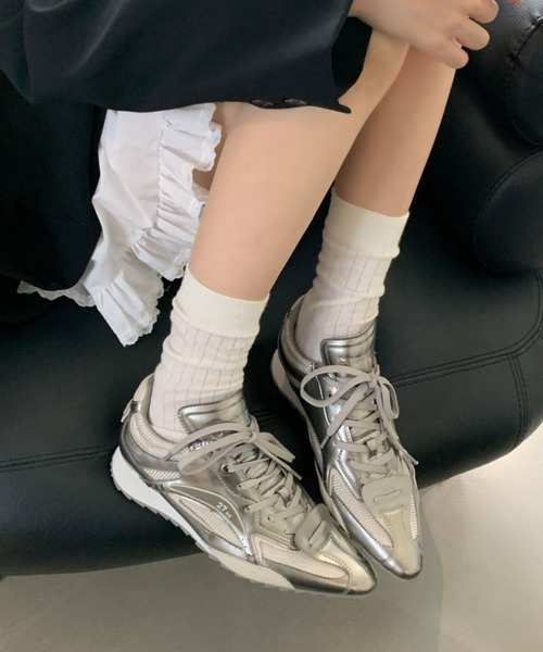 ◆DETAIL◇ \足元から主役級の輝きを♡近未来感漂うメタリックスニーカー/ ギラつきすぎない絶妙なメタリックシルバーが目を引く、トレンド感満載のローカットスニーカー。 スポーティーなフォルムに、異素材を組み合わせた立体的なデザインが高級感を演出します。 程よいボリュームソールで自然なスタイルアップを叶えつつ、歩きやすさも追求した1足。 どこか懐かしいレトロランニングシューズの要素と、モードな質感が融合した「今」履きたいスニーカーです。 【カラー展開】シルバー ◆COORDINATE◇ モードカジュアルに:オールブラックコーデの差し色として足元にアクセントを 甘辛MIXスタイル:フリルスカートやワンピースに合わせて、ガーリーな装いを程よくカジュアルダウン スクールガール風:画像のように白のクルーソックスと合わせて、清潔感のある足元に ストリートに:ワイドパンツやデニムからチラッと覗かせて、こなれ感たっぷりの着こなしに ◆POINT◇ ・存在感抜群のメタリック&シャイニー素材を使用 ・異素材パネルの組み合わせで奥行きのあるデザイン ・長時間履いても疲れにくいクッション性の高いソール ・季節を問わずスタイリングのスパイスとして活躍 ・スニーカー ・メタリックスニーカー ・シルバーシューズ ・厚底スニーカー ・韓国ファッション ・ストリートファッション ・大人カジュアル ・モード ・足元倶楽部 ・トレンドアイテム ・秋服 ・冬服 ・春服 ・通学コーデ ・お出かけコーデ ・26SS ・26春夏 ※着用身長によって画像イメージと異なる場合があります。 ※撮影環境により、実際のカラー、形状、デザイン等多少異なる場合がございます。 《 お知らせ 》 ▼商品のお気に入り登録 お気に入りアイテムの値下げ・再入荷・在庫1点などの通知を受け取ることができます。 ▼ブランドのお気に入り登録 新商品や再入荷、セール、クーポン配布などお得な情報を受け取ることができます。 是非、お気に入り登録してみてください♡
