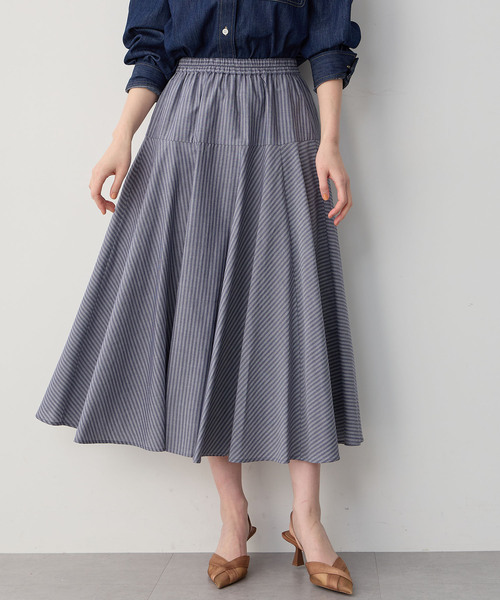 《トラッドな雰囲気を漂わせるストライプ柄のフレアスカート》優美に広がるフレアシルエットがフェミニンな着こなしを演出してくれます。切替を施すことでお腹周りはすっきりとした印象に。ウエストはゴムギャザー仕様になっていて、フィットする安心感のある穿き心地です。日常使いはもちろん、仕事やデートなどの様々なシーンにも活躍してくれます。【デザインポイント】・シルエットのきれいなフレアスカートです。・4枚接ぎで美しいシルエットを出し、ウエストのヨーク切り替えをデザインポイントにしています。----------商品情報----------透け感:なし伸縮性:あり裏地:あり光沢:なしポケット:なし---------------------------【着用シーン】・デイリー、ショッピング、女子会、旅行、レジャー、行楽、お出かけ、ランチ会、デート、学校行事、オフィスカジュア、通勤、仕事【スタイリング】・きれいめにシャツ、フェミニンにブラウス、カジュアルにTシャツと合わせるトップスを選ばないストライプスカートです。・カーディガンやジャケットなどのショート丈アウターやトレンチコートなどおロング丈春アウターともバランスが取りやすいです。・シューズはパンプスやヒール、サンダルやスニーカーまで幅広く合わせていただけます。【カラーバリエーション】・ネイビー(紺)...落ち着きのあるネイビーは合わせるトップスを選ばず、さまざまな場面で着ていただけます。・ブルー(青)...春夏カラーらしいブルーはシンプルにTシャツやカーディガンと合わせて。【サイズバリエーション】・Mサイズ(9号相当)・Lサイズ(11号相当)モデルは身長166cmでMを着用しています。【ブランド紹介】French Casualーフェミニンに生きる女性のためのリアルクローズがPetit Honfleur(プチオンフルール)です。カジュアルをベースに、ほどよくトレンドを落とし込んだアイテムは大人可愛く、“映え”間違いなし!着こなしやコーディネートで旬のスタイリングを提案します。【お買い物をお得にもっと楽しんで頂くために】▼商品のお気に入り登録▼完売カラーの再入荷通知や、ラスト1点の通知、プライスダウンしたセール通知も受け取ることができます。▼ブランドのお気に入り登録▼新作や再入荷等、いち早くブランドのお得な情報を受け取ることができます!