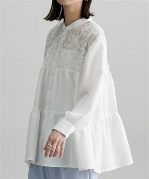透け感のあるレースがポイント★切替ティアードブラウス■デザインお顔周りのレースの透け感がポイントになるブラウス♪デザインはAラインなシルエットにフレアなティアードデザインで、腰回りの体型カバーにも★・前開きタイプのブラウスなので、着脱もラクチン・ちょっとしたお出かけやオケージョンのシーンでも活躍すること間違いなしなおすすめのブラウスです♪■素材薄手の布帛素材を使用♪■おすすめのスタイリングオフィススタイルやオケージョンスタイルまで対応◎な、万能ブラウスAラインでティアードなデザインなので、ボトムとの着合わせがおすすめです♪動いた時のシルエットもキレイに見せてくれますよーーー明日ちょっと褒められる服ーーー大人トレンドを意識したこだわりのアイテムと着こなしでアナタの毎日に輝きを。ただシンプルできれいなだけじゃ物足りない。カジュアルすぎず、スタイリッシュで大人の品性を感じる着こなしに。そんな、こなれたオシャレを楽しむ女性に寄り添う、 新鮮なリアルクローズをご提案します。<仕様>[本体]ポリエステル100% [別布]ポリエステル100%<洗濯方法>洗濯機OK ネット使用■キーワード20代、30代、40代、きれいめカジュアル、きれかじ、オフィスカジュアル、キレカジ、シャツ、トップス、ファッション、ブラウス、レディース、夏、大人、大人カジュアル、春、通勤カジュアル、春服、夏服