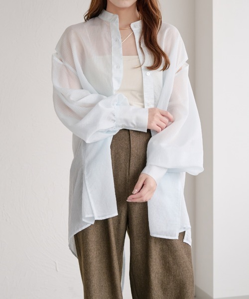 春夏に1枚は持っておきたいシアーブラウス (シアーストライプと無地のアソートとなっております。) ■デザイン ふんわりとしたシルエットで、着るだけでおしゃれ見えする1枚です。 大胆なバックデザインと肩のスリットがコーデのポイントに◎ さらっとした生地感なので、夏の気温調節にも最適です。 バンドカラーで首元もすっきり見え。 シアー素材の為、トップスとしてインナーとのレイヤードを楽しむのはもちろん、 前を開けて羽織としても使えるので春から秋までご着用いただけます。 ルーズな丈感がお尻周りをしっかりカバー。 ■スタイリング 羽織って着ても、1枚でも着れる万能アイテム。 スラックスで大人カジュアルスタイル、 ナロースカート合わせでキレイめスタイリング、 デニムパンツ合わせでカジュアルなど どんなスタイリングにもマッチします◎ …………………………………透け感:あり 裏地:なし 伸縮性:なし …………………………………・アテンションタグや洗濯表示を必ずご確認の上、ご使用下さい。・ご覧のモニター環境や撮影環境により、実物の商品と多少色味が異なって見える場合がございます。・サイトに表示されているカラー名、商品名は実際のお届け商品のタグに記載されているカラー名、商品名と異なる場合がございます。・同商品でも、生産の過程で1~2cmの個体差が生じる場合があります。 ▼商品のお気に入り登録 完売カラーの再入荷や、ラスト1点の通知、セールの際の通知を受ける事ができます。 ▼ブランドのお気に入り登録 新商品や再入荷など、いち早くブランドのお得な情報を受け取ることができます。 #シアーシャツ #シアー #透け感 #長袖 #日よけ #羽織り #はおり #レイヤード #バンドカラー #カジュアル #抜け感 #きれいめ #大人カジュアル