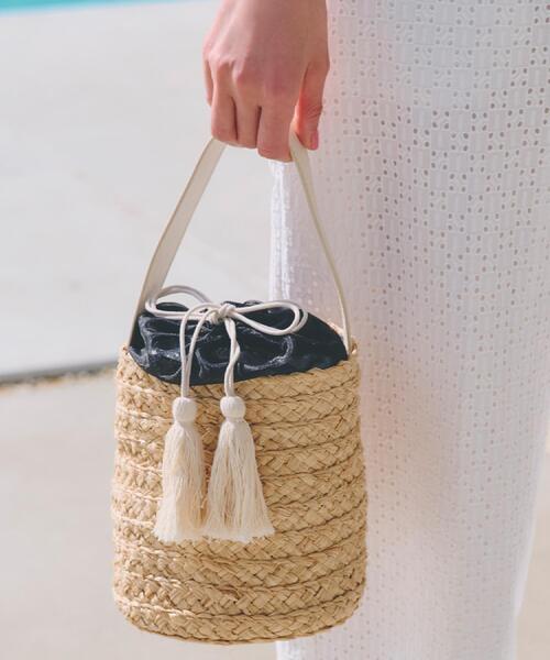 【デザイン】 ラフィア編みと合成皮革を組み合わせた巾着付きバケツ型ショルダーバッグ。 巾着の素材もシアーでヒモの先のタッセルパーツがおしゃれ。 素材の組み合わせで大人っぽくい天然素材の風合いが良いカゴバッグです。 【仕様】 ・ポケット数:内側×1 ※照明の関係により、実際よりも色味が違って見える場合があります。また、パソコン・スマートフォンなどの環境により、若干製品と画像のカラーが異なる場合もございます。 【25SS】 店舗へのお問い合わせ商品番号:769-02509 ●製品寸法: 00:高さ18cm 幅(上部)15cm 幅(下部)15cm マチ14cm 持ち手上がり14cm 備考:重量:約140g(サンプルサイズ)