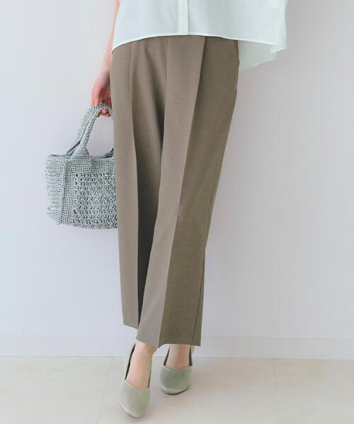 GLOW7月号【お仕事黒パンツ3本で夏のWORK服コーデ】に掲載された商品です綺麗見えなのに涼しく着用できる!優秀ワイドパンツ【デザイン】足元がすっきりと見えるクロップド丈のワイドパンツ。センタープレスを入れることできちんと見えが叶い、デイリー使いからオフィススタイルまで幅広く着こなしていただける1枚。ゴールドのDカンを付けた共布のベルトがセットされており、トップスをインすると華やかなスタイリングが完成します。広すぎない裾幅のストレートワイドシルエット。センタープレスに繋がるワンタックで、お腹周りのにゆとりを持たせています。ウエストは着脱がらくちんな穿きこみのゴム仕様。ベルトを締めるとゴム部分が隠れるため、イージーな着用感ながら後ろ姿も綺麗に見えます。夏に嬉しいマルチな機能付きで、気軽に着用できながら綺麗なスタイルを保っていただけるおすすめボトムです!【素材】通気性が良くムレにくく、風通しが良い高通気機能のある素材を採用。まるで麻のようなドライタッチが魅力のポリエステル素材を使用し、さらりと清涼感のある穿き心地で汗ばむ時期にも最適な素材です。繊細な凹凸がある素材でフラットすぎず、単品の華やかさも持ち合わせています。その他にも・マシンウォッシャブル・吸水速乾・接触冷感・防シワ性を備えており、取り扱いのしやすさときちんと見えを両立してくれるマルチな機能が魅力的な素材です。クリアで上品なブラック、ニュアンスがキレイなカーキ、肌なじみの良いベージュ、チャコールストライプの4色展開です。【スタイル】夏のキレイめスタイルからカジュアルスタイルまで幅広く着こなせていただけます。ベルトを締めたトップスインしたスタイルがおすすめですが、すっきりとしたストレートワイドシルエットの為、長めのトップスを合わせてもバランスがとりやすくなっています。ジャストレングスなのでスニーカーや低めのサンダルともバランス良く合わせれます◎もちろんヒールと合わせてもスタイルアップして見えておすすめです。【仕様モデル情報:身長166cm B80 W59 H86 着用サイズ:02(M)店舗へのお問い合わせ商品番号:768-62034●製品寸法:01(S):W66cm H104cm 股下61cm 前股上30cm 渡り幅34cm 裾幅26cm02(M):W69cm H107cm 股下62cm 前股上31cm 渡り幅36cm 裾幅27cm03(L):W72cm H110cm 股下63cm 前股上31cm 渡り幅37cm 裾幅28cm04(LL):W75cm H113cm 股下64cm 前股上31cm 渡り幅38cm 裾幅29cm05(3L):W78cm H116cm 股下64cm 前股上31cm 渡り幅39cm 裾幅29cm備考: