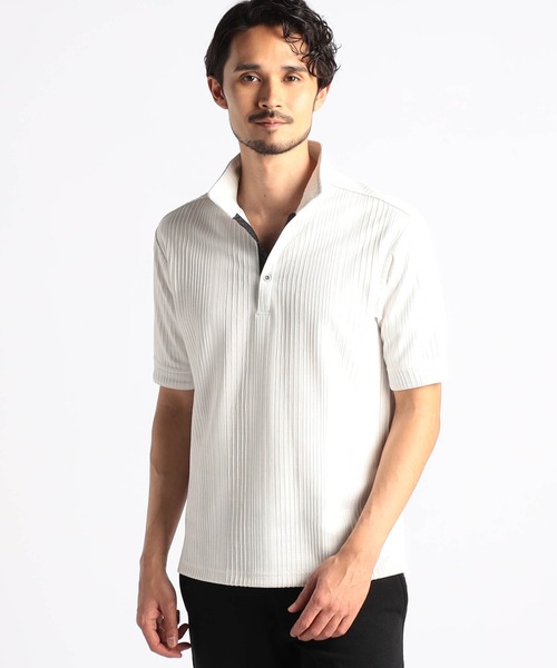 ■デザイン 張りのある素材感でスポーティに着こなせるイタリアンカラーポロ。要所の別生地には布帛のピンストライプを使い上品なギミックをプラスしました。しっかりとした素材でイタリアンカラーポロのポイントである前開きのVゾーンを綺麗に保ちます。衿に仕込んだワイヤー、袖口、裾のスリット等、ワンライク上の仕様を随所に盛り込んだポロシャツに仕上げています。独特なジャカード゙柄の表情豊かなテキスタイルデザインが、スタイリングを魅力的に演出してくれる一着。インナーとしては勿論、1枚で着ても存在感抜群な仕上がりになっています。 ■サイズ ほどよいリラックスフィットで着心地抜群。ウエストにやや絞りを入れたシャープなシルエットも魅力です。 ■素材 膨れ編みでチェック柄を表現したブリスタージャカード素材。立体感のある編地にすることで独特な印象の地柄感に仕上げました。綺麗な艶感と上質な張り感も魅力です。ポリエステルのサラッとした風合いと凹凸のある編地で清涼感を持たせ快適な着心地です。 ※49ブラックは、ブラック×オフカラーになります。91その他2は、オフ×ブラックカラーになります。92その他3は、オフ×サックスから―になります。 伸縮性:少しあり 生地の厚さ:普通 生地:UVカット加工 ロゴ:刺繍