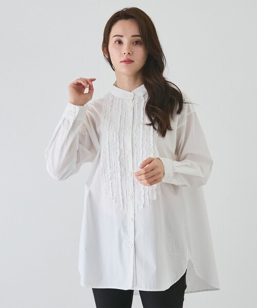 【デザイン・シルエット】 ピンタックのようにフリルが並んだブラウス。 様々なフリルの大きさがこだわりのポイントです。 腰回りが隠れる丈感で体型カバーもバッチリ◎ ラウンドヘムでアウトスタイルも可愛く着用できます。 【素材感】 ハリのあるコットン素材 【カラー】 01クロ 11シロ 27ベージュ 【スタイリングポイント】 細身のボトムに合わせるのがおすすめ。 デニムやペンシルスカートと好相性です。 ウエストインをしてフレアスカート合わせも◎ 裏地:なし 光沢感:なし 透け感:シロ若干あり ポケット:なし 伸縮性:なし 生地の厚さ:普通 ボタン:あり その他仕様:なし 季節:春秋 ※撮影時の光、お使いのモニター環境によって色の見え方が違う場合がございます。予めご了承ください。 モデル身長:168cm 着用サイズ:M