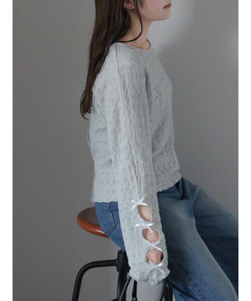 袖スリットに施されたミニリボンが可愛いカットソー。 ぽこぽことしたチェックのような凹凸感のある柄が豊かな表情を演出してくれます。 コーディネートに取り入れることで、愛らしいアクセント使いにも活躍してくれる1着です。 ※商品画像は、撮影環境やお客様のご利用のPC・スマートフォンのモニター環境などにより実物と色味に差異がある場合がございます。