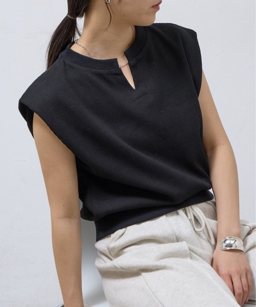 【コーデの主役に!ワッフルキーネックフレンチスリーブトップス】フレンチスリーブのコンパクトなワッフル地トップス。首元と裾部分にリブを施しカジュアルな印象に。衿元はキーネックデザインで、顔まわりを華やかに、すっきりみせてくれます。凹凸のある柔らかいワッフル素材で、丈夫ながらもリラックス感があります。【商品ポイント】・凹凸のある柔らかいワッフル素材・キーネックデザインですっきりした印象に・ベーシックなカラー展開----------------------------------------------------■商品特徴洗濯方法:洗濯機洗い可(弱)裏地:なし透け感:ややあり伸縮性:ややあり光沢感:なし生地の厚さ:普通----------------------------------------------------■素材本体: ポリエステル65%,綿35%リブ部分: 綿50%,ポリエステル45%,ポリウレタン5%----------------------------------------------------※着用、お取り扱いの際は、商品についている品質表示とアテンションタグを必ずご確認下さい。※商品タグに記載されている商品名がWEBでの表記名と異なる場合があります。※画像の商品はサンプルです。実際の商品と仕様、加工、サイズが若干異なる場合がございます。 ※照明の関係により、実際よりもやや明るく見える場合がございます。またパソコンなどの環境により、若干製品と画像のカラーが異なる場合もございます。予めご了承くださいませ。【お気に入り登録】してお得な情報をCHECK!!・「商品のお気に入り登録」で再入荷通知や、ラストの通知、セール通知も受け取ることができます。・「ブランドのお気に入り登録」で新商品や再入荷など、お得な情報を受け取ることができます。