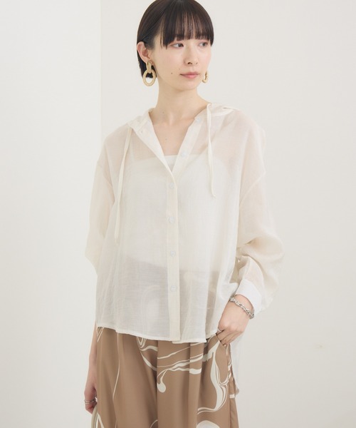 程よいシアー感が今っぽい、羽織として使えるシャツパーカー<POINT>程よいシアー感が特徴のシャツ仕立てのパーカー。涼しげで軽やかな印象を演出し、初夏から夏にぴったりのアイテムです。【デザイン・シルエット】前開き仕様のシャツ仕立てデザインは、羽織物としても使用可能。幅広いコーディネートに対応する万能アイテムです。ゆったりシルエットが気になるボディラインを拾わず、ストレスフリーで着こなし可能です。【素材感】ナイロンの薄手素材を採用し、軽やかで肌触りも良好。暑い季節でも快適に過ごせる特性が魅力です。さらに、手洗い可能でお手入れも簡単です。【カラー】ホワイト カーキ 2色展開【スタイリング】前を開けて羽織物として初夏から夏の日焼け対策、冷房対策としておすすめ。軽やかなナイロン素材でカジュアルからキレイめまで幅広いスタイリングに使えます。裏地:なし光沢:なし伸縮性:なし透け感:あり生地の厚さ:薄手ポケット:なし※照明の都合上、多少の色ブレが生じてしまう可能性がございますので、予めご了承くださいますようお願い致します。---------------------------------------------------●お気に入り登録でお得情報を手に入れよう!「商品のお気に入り登録」をすると、再入荷通知や、ラスト1点の通知、セールの通知など、お得情報が届きます。また、マイページでいつでも確認が可能になります。「ブランドのお気に入り登録」をすると、新商品や再入荷、などいち早くブランドの最新情報をお届けします。ぜひ、ご利用ください。----------------------------------------------------