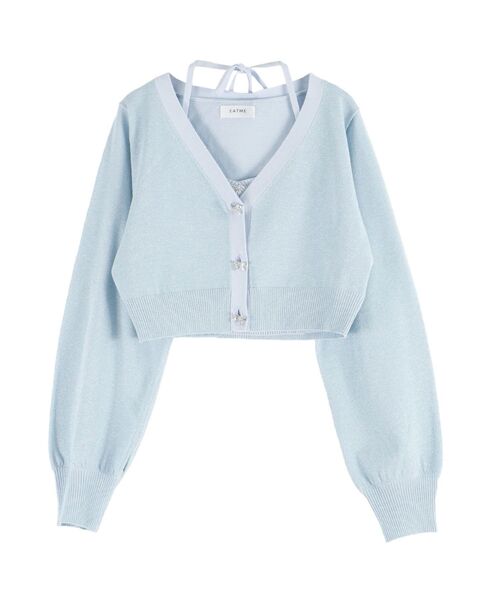 コーデのアクセントになるラメ糸のニットがフェミニンな雰囲気を演出してくれるアンサンブルです。 リボンモチーフのビジューボタンが華やかさをプラスしつつキュートな印象を引き立てます。キャミに施した取り外し可能な紐は腕とネックで結ぶことができ、気分に合わせて使っていただけます。 別々で着用ができてコーデの幅が広がります。デニムボトムスに合わせて大人カジュアルコーデにするのもオススメです。 ---------------------------------------------- ♡商品のお気に入り登録 完売カラーの再入荷通知や、ラスト1点、セールの通知をお知らせ致します。 ♡ブランドお気に入り登録 新商品や再入荷など、いち早くブランドの情報を受け取ることができます。 ---------------------------------------------- ※サイズは、実寸サイズを測っているため多少誤差がでる場合があります。 ※重量は目安として、参考にして下さい。 ※商品画像は着用イメージです。 光や角度により、実物と色味が異なる場合がございます。 商品の撮影はサンプルで行っている為、カラーやサイズ等に変更がある場合がございます。 ご覧のモニター環境により実際の商品と多少色味が異なって見える場合がございます。 ご了承ください。 ※他のキャンペーンにより、期間中に価格が変動する場合があります。 ※セールは予告なく終了させていただく場合もあります。