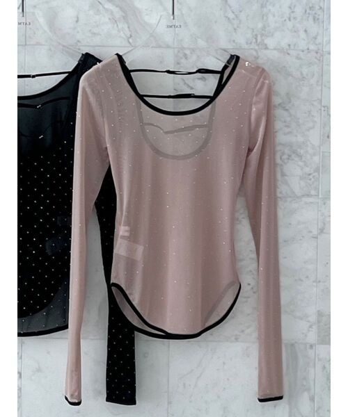 オープンバックディテールが目を惹くシアートップスです。キラキラと輝くラインストーンを散りばめた伸縮性のあるメッシュ素材です。ネックラインや袖口、裾にはサテンのパイピング始末で高級感のあるデザインに仕上げました。背中の深めの開きに施したブラックのサテンゴムがフェミニンなアクセントになります。ビスチェやワンピースのインナーとしてレイヤードしてコーデするのがオススメです。----------------------------------------------♡商品のお気に入り登録完売カラーの再入荷通知や、ラスト1点、セールの通知をお知らせ致します。♡ブランドお気に入り登録新商品や再入荷など、いち早くブランドの情報を受け取ることができます。----------------------------------------------※サイズは、実寸サイズを測っているため多少誤差がでる場合があります。※重量は目安として、参考にして下さい。※商品画像は着用イメージです。 光や角度により、実物と色味が異なる場合がございます。 商品の撮影はサンプルで行っている為、カラーやサイズ等に変更がある場合がございます。 ご覧のモニター環境により実際の商品と多少色味が異なって見える場合がございます。 ご了承ください。※他のキャンペーンにより、期間中に価格が変動する場合があります。※セールは予告なく終了させていただく場合もあります。