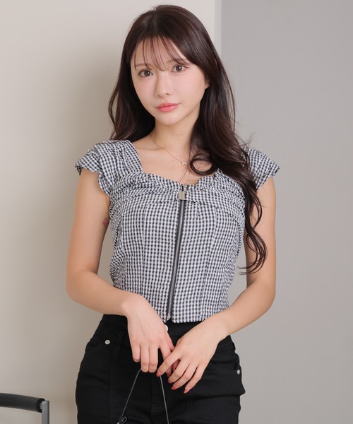 【point/coordinate】・フロントZIPとホックのメタル感でエッジのきいたデザイン。・肩はタックとギャザー入で立体感があり肩周りをしっかりカバー。・身頃のコルセットのような縦の切り替えでバストの立体感をしっかり出しているので女性らしいシルエットに。・後ろ側は伸縮性があり着やすいゴムシャーリング。・コンパクトで着るだけでスタイルアップできるクロップド丈。●カラー・着やすいベーシックカラーのホワイトとブラック。・ミックス1はギンガムチェックで春夏らしい柄。●スタイリング・デニム合わせでカジュアルに着こなすのがおすすめ!・マーメイドスカートを合わせると女性らしいスタイリングに。▼おすすめコーデアイテム000452300280 / センタースリットフレアデニムパンツ000453500380 / インナーショーパン付レース切替マーメイドスカート【fabric】・柔らかくハリのある生地を使用。・裏地もついているので透け感も気にならず安心。