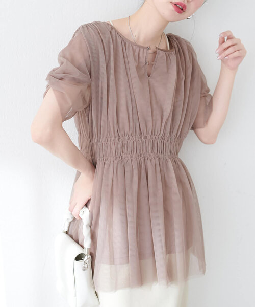 【2025SS natural couture】 osono品番から大人のためのチュニックが再登場! ■Design 前後2WAY仕様で、広めのクルーネックとキーネック、どちららの顔も楽しめるチュニックが登場。 トレンドのチュールを使いつつ、甘すぎず大人が着やすいアイテムに仕上げました。 チュールを贅沢に使用しているので、きちんと見えが叶います。 袖はチュールだけを重ねたデザインなので、大人レディな印象に。 二の腕にボリュームが出るよう設計しているので、華奢見え効果も抜群です。 ■Styling ふんわりとボリュームのあるチュニックなので、ボトムはナロースカートなど落ち感のあるアイテムがおすすめ。 デニムパンツでカジュアルダウンしても品良くきまります。 キャミワンピースのインナーにすると、コーディネートのトレンド感がぐっと高まります。 ■Fabric ふんわりと柔らかなチュール素材を使用。 チクチク感もなく快適にお召し頂けます。 ========================= 透け感:袖部分のみあり 裏地:身頃部分あり 伸縮性:あり 光沢感:なし 生地感:ふんわりと柔らかなチュール素材 ========================= ※着用、お取り扱いの際は、商品に付いている品質表示とアテンションタグを必ずご確認ください。 【お気に入り登録でお得な情報がいっぱい】 ・「商品のお気に入り登録」で再入荷通知や、ラスト1点の通知、セール通知をいち早く受け取ることができます。 ・「ブランドのお気に入り登録」で新商品や再入荷など、お得な情報を受け取ることができます! ※店舗の入荷時期は商品によって異なります。 店頭の在庫状況につきましては各店舗にてお問い合わせください。 ※撮影時の光の関係で、画面上の画像と実際のお色とでは若干の色差が生じる可能性がございます。 また、ご覧いただいているモニター画面や、お使いのブラウザによっても、お色の違いがございますことをあらかじめご了承くださいませ。 20250328 2025SS_natu 25SS