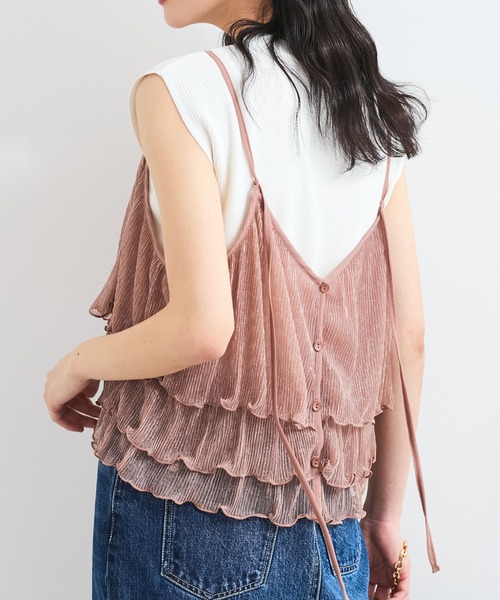 一枚プラスオンでコーディネートが華やかになる2WAYビスチェ◆2025春夏◆ <POINT>・前後2WAY仕様で、マルチな着こなしが可能。・動くたびに煌めくラメ生地と3段のフリルで表情が魅力的な1枚。・ショルダーストラップは調節可能なリボン紐タイプで、インナーをレイヤードする際も窮屈感なく着こなせます◎・クロップド丈なので着こなしのバランスが取りやすくレイヤードに最適!【デザイン・シルエット】 3段に連なるティアードフリルがフェミニンなアクセントになる1枚。女性らしさを引き立てつつも、甘くなりすぎない絶妙なフリルのバランスにこだわりました。柔らかく、やや落ち感のある生地なので広がりすぎず、着膨れしにくいシルエットです。大人カジュアルにも、パーティースタイルにもフィットする万能アイテムです◎ 【素材】柔らかい素材で、着膨れしにくいのでインナーを選ばす合わせられます。軽やかでさらっとした肌触り。 【カラー】ブラック、シルバー、ピンク系の3色展開。様々なインナーにレイヤードしやすいカラーをセレクト! 【おすすめのスタイリング】Tシャツ×デニムなどのシンプルなスタイリングに合わせるだけで、一気に旬なスタイリングに◎タンクトップに合わせてシアーカーディガンなどを羽織ると抜け感のあるスタイルにも。中に合わせるインナー次第でどんな季節でも着用でき、着回し力が抜群なアイテムです。 ----------------------------- 裏地:なし 光沢感:ややあり 透け感:ややあり 伸縮性:なし ボタン:あり(開閉可) 生地の厚さ:薄手 肩紐:調整可 季節:春、夏、秋 ----------------------------- 【モデル着用サイズ】 全色モデル身長:168cm、着用サイズ:F ※こちらは、WEB店舗限定の商品です。実店舗での販売はしておりません。 ※画像の商品はサンプルです。 実際の商品と仕様、加工、サイズが若干異なる場合がございます。 ※画像によっては実際の色味と異なる場合があります。正しい色味は生地アップ画像をご確認ください。