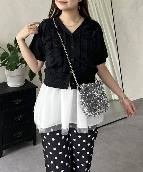 大人フェミニンに楽しむ半袖カーディガン●チュールフリルがコーデを華やかに●チュールフリルが肩幅を華奢見せしてくれます●1枚で着映えする夏の主役アイテムです●Vネックで顔周りすっきりと☆レイヤードインナーキャミソール(PVZ1051306A0005)と合わせると体型カバーばっちりに!--------------------------------------------------------------生地の厚さ:普通伸縮性:ややあり透け感:なし裏地:なし洗濯方法:ご自宅で手洗い可--------------------------------------------------------------※商品のお取り扱いに関しましては、商品に付属のアテンションカード、洗濯ネームをご覧ください。※撮影場所やお使いのモニター環境により若干お色味が異なる場合がございます。特にロケの撮影では明るく見える傾向にございます。 ※サイト上ではフリーサイズの表記ですが、商品タグにはMサイズと表記されている場合がございます。その場合、ワンサイズでのご用意となりますのでサイズミスなどではございません。詳しいサイズはサイズスペックをご確認いただきますようお願い致します。※サイト上でのカラー名とお届けした商品に記載されているカラー名が異なる場合がございますので予めご了承ください。<返品・キャンセルについて>・着用・洗濯後の返品は致しかねます。・商品到着後、着用前に商品を確認して頂きますようお願い致します。
