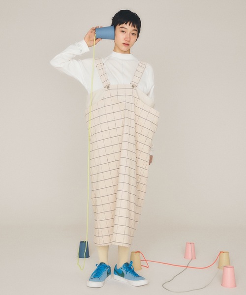 SNEEUW 2025 AUTUMN & WINTER電線や電線を支える碍子(がいし)をイメージしたプリントを施した太畝コーデュロイのジャンパースカートぱっと見はチェックですが、ゆらぎのあるラインによって独特のニュアンスが生まれます。ストレートな筒状パターンで着ると両脇がくたっと倒れる独特のシルエット。そこはかとなくユーモアがある、そして体をすっと綺麗に見せてくれるフォルムです。二重構造になっていて内側は少し狭まっているので中が見えず安心。重なった部分はポケットになっています。バックはベンツ明きで歩きやすく作られています。MODEL Nanami Keys(WOMEN) H168 着用サイズ ONESIZETiara (WOMEN) H170 着用サイズ ONESIZESNEEUW 2025 AUTUMN & WINTER自宅近くにある電話ボックス。夜、そこの前を通ると煌々と明るく光る電話ボックス。電話するためだけの場所があった時代のことを懐かしく思い出したり、その後の技術の進化、人間のメッセージをやり取りするのための熱意に、はっとしたり、楽しかったり、時に面倒だったり…。大事な送受信のためのいろんなツールをデザインに忍び込ませたコレクションです。ANLIO OFFICIAL、ZOZOTOWN にて在庫発売ANLIO OFFICIAL→会員10%割引、ZOZOTOWN →paypay、ZOZOポイント 各ショップによりサービス内容が異なります