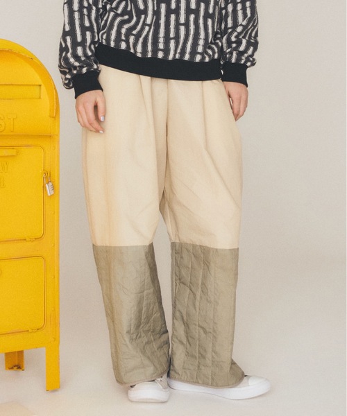 SNEEUW 2025 AUTUMN & WINTER東炊きという江戸時代の染色方法を現代で再現した小さい釜を使って生地を使用。柔らかく染め上げる手法で染められたオリジナルのキルティング生地を裾に使ったワイドパンツ。キルティング生地は表裏色の違うナイロン生地を使っていてステッチ色はスモーキーな水色。キルティングのグレーはグリーンがかった色味です。加工によって色の濃淡、くったりしたシワが生まれていて、ニュアンスのあるテキスタイルです。上半分は洗いのかかったコットンナイロンでできていて、程よく体に馴染み、膝から下は厚みのあるキルティング素材でシルエットがキープされます。パンツの裾端はパイピングされていて、着る人の身長に合わせて折り上げて履いていただけます。キルティングがリバーシルブルなので折り返したときの色の変化も楽しめます。ウェストはゴムと紐が通っています。幅広い身長、体格の方に履いていただけるSNEEUW定番の人気の形のワイドパンツです。MODEL Nanami Keys(WOMEN) H168 着用サイズ ONESIZELim (MEN)H182cm 着用サイズONESIZESNEEUW 2025 AUTUMN & WINTER自宅近くにある電話ボックス。夜、そこの前を通ると煌々と明るく光る電話ボックス。電話するためだけの場所があった時代のことを懐かしく思い出したり、その後の技術の進化、人間のメッセージをやり取りするのための熱意に、はっとしたり、楽しかったり、時に面倒だったり…。大事な送受信のためのいろんなツールをデザインに忍び込ませたコレクションです。AANLIO OFFICIAL、ZOZOTOWN にて在庫発売ANLIO OFFICIAL→会員割引、ZOZOTOWN →paypay、ZOZOポイント各ショップによりサービス内容が異なります