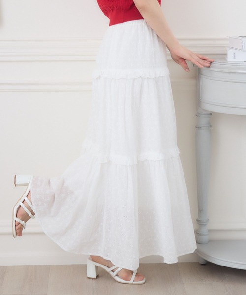 <フリルたっぷりの少女感溢れるマキシ丈スカート>▼デザインティアードシルエットで、切替部分にフリルが施されたレーススカート。ウエストは360°ゴムになっているので、伸縮性たっぷり。綿の軽い素材感で、風に靡くシルエットが少女感溢れるピュアなスタイリングに!▼コーディネートシンプルにTシャツ合わせでも可愛くコーデが決まるアイテム。フリルがガーリーで何に合わせても可愛くコーデを仕上げてくれます。------------------------------生地感:普通伸縮性:なし透け感:なし裏地:ある------------------------------▼ブランド紹介ems excite (エムズエキサイト)“more fun more cute”今をもっと楽しくもっと可愛くいたい女の子に向けたgirly cuteなブランド#綿スカート #ロングスカート #マキシスカート #ガーリーアイテム #レーススカート▼注意事項※撮影環境やモニター環境によって実際の商品とお色味が多少異なってみえる場合がございます。品番:ES537531G002 / 品名:綿レースSK