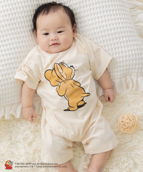 大人気の「トムとジェリー」の半袖カバーオール!ジェリーとタフィーの楽しいイラストがかわいい! 毎年人気のジェリーの後ろ姿もあります! 前開きでお着替えもラクチンです! 【トムとジェリー/Tom and Jerry】 トムとジェリー(Tom and Jerry)」は、アメリカ合衆国のメトロ・ゴールドウィン・メイヤー(MGM)スタジオによって製作された短編アニメーションシリーズです。1940年から1958年にかけて、13分から10分程度の短編作品が161本製作され、その後も長編映画やテレビアニメーションとして継続的に制作されています。作品のストーリーは、ネズミのジェリーと猫のトムが繰り広げる追いかけっこを中心に展開されます。シリーズ全体を通して、音楽の使い方や劇中の視覚的なギャグなどが特徴的です。また、ハンナ・バーベラ・プロダクションなど多くのアニメーションスタジオに影響を与えた作品の一つでもあります。