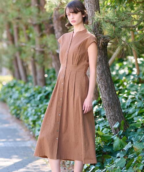 【1枚で決まる!大人上品なフィット&フレアワンピース】トルコのテキスタイルメーカーACAR(アーカー)社と国内生地メーカーで作られた素材を使用したワンピース。コットン混素材で作られた珍しいリップル素材。ポコポコとした生地表情の楽しさに加え、高温多湿な日本の夏でも生地の凹凸による肌離れの良さ、天然素材の吸湿性の高さにより快適な着心地です。タック入りのフィット&フレアシルエットでキチンと感がありながら、後ろウエスト部分にゴムが入っているのでラフな着心地です。ウエストの切り替えデザインがスタイルアップ効果も期待。タックがたっぷりと入っているので、身体のラインを拾いにくく着やすくなっています。袖はフレンチスリーブデザインで、肩を程よく隠してくれるのも嬉しいポイント。素材に程よい厚みとハリ感があるので、シルエットを綺麗にキープしてくれます。【仕様】・ポケット数:横×2・ウエスト後ろゴム・裏地なし※照明の関係により、実際よりも色味が違って見える場合があります。また、パソコン・スマートフォンなどの環境により、若干製品と画像のカラーが異なる場合もございます。モデル情報:身長168cm B80 W59 H87 着用サイズ:38(M)店舗へのお問い合わせ商品番号:085-52007●製品寸法:34(SS):着丈116cm B94cm 裄丈26cm 肩幅50cm36(S):着丈117cm B97cm 裄丈27cm 肩幅52cm38(M):着丈121cm B100cm 裄丈28cm 肩幅53cm備考: