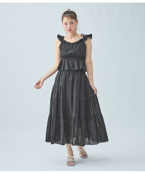 サイドだけのボリュームで、上手に着太りを防ぐロマンティックスカート。【おすすめポイント】・気になる腰まわりはボリュームを抑え、スタイルアップできるティアードスカート。・ストライプやダイヤ柄入りの織り生地が、タテのラインを強調しすっきり見せる。・同素材の「デコラティブフリルキャミソール」とのセットアップもおすすめ。【こんな人、こんな時に】・スタイリングにロマンティックなエッセンスを取り入れたい・腰まわり・脚をカバーしつつ、可愛くスタイルアップしたい【デザイン】・裾に向かってフレアが広がるロング~マキシ丈・ウエストは後ろ側がゴム仕様ではきやすい・腰骨下に一周、3段のタックをたたんでメリハリをプラス・両サイドを切り替えて、2段のギャザーでボリュームアップ。前後中央はふくらみを抑えるので、着太りを防ぐ・裾一周の切り替えから下は、たっぷりのギャザーで甘い表情に・ミディ丈の裏生地付き【素材】・表生地はほんのり透け感のある、コットン100%の織り生地。タテ方向にストライプや、ダイヤ型が連なった柄入り・裏生地はハリのあるポリエステル生地モデルサイズ:160cm着用サイズ:ワンサイズ