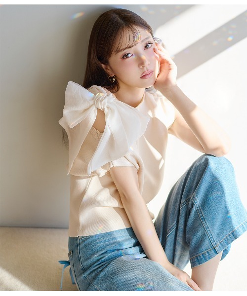 アシンメトリーなバランスがコーデに洗練をプラス。大人に似合うリボンアレンジ。【おすすめポイント】・右肩に大きなリボンをセット。遊び心を感じるスタイリッシュなニットトップス。・ベースはシンプルなハイゲージニットなので、コーディネートしやすい。・バスト付近まではゆとりがあり、裾はフィットするやせ見えシルエット。【こんな人、こんな時に】・インパクトのあるフェミニンなトップスがほしい・シンプルな中に、ひとひねり加えたデザインが好き【デザイン】・ワンショルダーのニットトップスをベースに、右肩を大きなリボンでつないだアシンメトリーデザイン・リボンはほどけるので、自分好みの形に結ぶことが可能・身頃からひと続きのフレンチスリーブで、二の腕を適度にカバー。右袖の方がややレングス長め・全体にゆとりがあり、裾はすぼまってフィット。ボディラインをカバーし、すっきりした印象で着こなせる・腰骨上くらいの丈【素材】・身生地は、適度に厚みのあるハイゲージニット・さらりとした肌ざわりで涼やか・リボンはほんのり透け感のあるオーガンジー。全色ともアイボリーカラーモデルサイズ:160cm着用サイズ:ワンサイズ