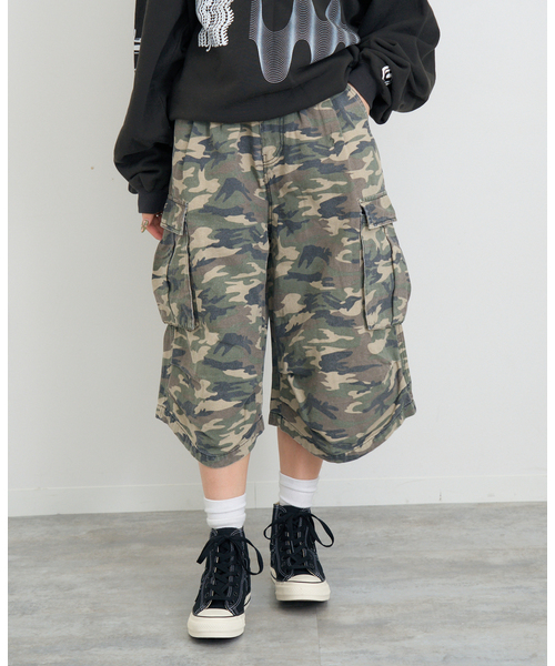 綿のダック生地にカモフラのプリントのビッグカーゴパンツ。半端丈のハーフパンツでのユニセックスで展開。S.M.Lの3サイズ展開になります。生地にブリーチ加工を施すことで柄の主張強すぎず着古したような風合いに。ですトレンドのコンパクトトップスと合わせるバランスがおすすめです。※取り扱いについては、商品についている品質表示にてご確認下さい。※照明の関係により、実際よりも色味が違って見える場合があります。またパソコン・スマートフォンなどの環境により、若干製品と画像のカラーが異なる場合もございます。※商品の色味は、商品アップ画像をご参照ください。モデルサイズ:身長:162cm 着用サイズ:M本体:手洗い可能