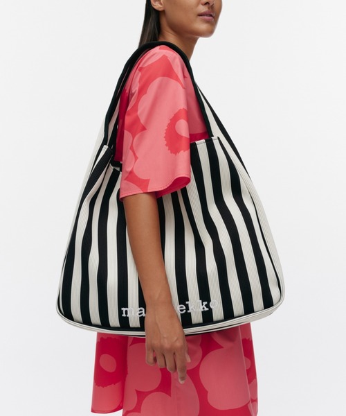◆特典◆ ・ノベルティ付きニットバックの販売(ノベルティ:マリロゴファブリックバック&UNIKKOステッカー) ※ノベルティはなくなり次第終了 《MORE SUSTAINABLE》 【テキスタイルデザイン:Maija Isola(マイヤ・イソラ)】 Merirosvo(メリロスヴォ):海賊 鮮明な色使いのストライプ柄に包まれたショルダーバッグ。リブのような畝を持つ厚みのあるニット素材で、モード感のある表情に仕上げています。ストラップを肩に掛けると、脇にぴったりと収まる作り。マチもある大きめなコンパートメントは、たっぷりの容量を誇ります。旅行やジム通いなどにも活躍するサイズ感。インパクトのあるルックスでコーディネートの風格も高める1点です。 ※商品ひとつずつの柄の出かたが異なるため、表示画像のディテールと多少異なるデザインのものが届く場合がございます。予めご了承ください。 こちらの製品にはリサイクルポリエステルを100%使用しています。 タテ39 ヨコ47 マチ9.5 持ち手上がり10.5
