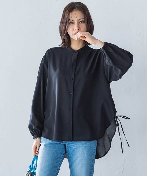 【デザイン】サイドに垂れたヒモデザインがおしゃれ感のあるバンドカラーブラウス。前後差をつけたデザインで横からのスタイルも様になり、ワイドパンツとも合わせやすいブラウスです。袖口もゴムを入れて捲るだけでボリュームスリーブが簡単に完成するこなれデザイン。フロントのクルミボタンデザインもさりげないアクセントに。----------------------------------------------------------------洗濯方法家庭洗濯:液温は40℃を限度とし、洗濯機で弱い洗濯ができる。自然乾燥:日蔭の吊り干しがよい。アイロン:底面温度160℃を限度としてアイロン仕上げができる。ドライクリーニング:石油系溶剤による弱いドライクリーニングができる。----------------------------------------------------------------■モデル身長 165cm/着用サイズ M※商品タグに記載されたサイズはヌードサイズです。実際の商品のサイズは商品情報の実寸をご確認ください。※画像の商品はサンプルとなりますので実際の商品と仕様、加工、サイズが若干異なる場合がございます。※お客様のモニター環境により実際のお色と多少異なる場合がございます。※撮影状況や光の当たり具合により、色合いが異なって見える場合がございます。▼商品のお気に入り登録ハートマークをクリックし、お好きなカラーを選んでお気に入りに登録完売カラーの再入荷通知や、ラスト1点の通知、セールの通知も受け取ることができます。▼ブランドのお気に入り登録新商品や再入荷等、いち早くブランドのお得な情報を受け取ることができます。