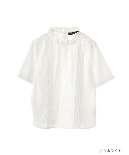 衿フリルと前身頃のタックが上品なブラウス。高密度ローンシャンブレーのしっかりしたハリのある生地ですっきりと見えます。綿100%で通気性も良く着心地も◎。1枚でワイドパンツやスカートにあわせるのはもちろん、ベストとのコーデで衿元のフリルをのぞかせるのもオススメです。※後ろボタン開きになります。