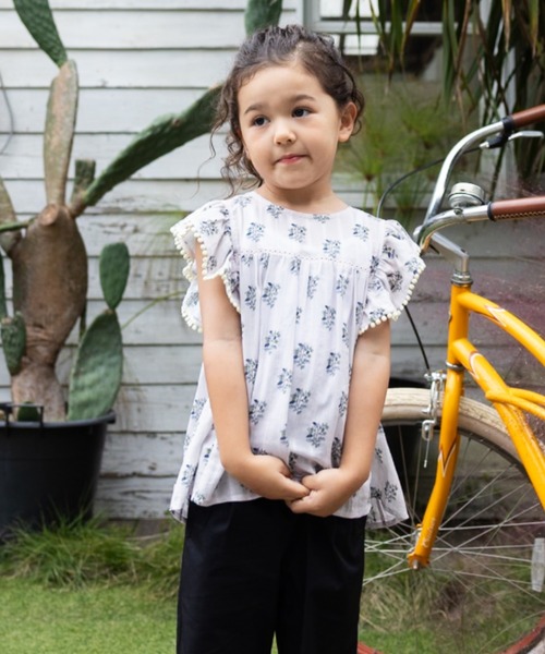 [140-160]もありますベースはラメ糸入りのローンジャガード素材。オリジナルプリントのエスニック感漂うフラワーモチーフ柄でリゾートっぽく夏らしい雰囲気に。大振りの袖フリルと水玉レースがかわいい♪