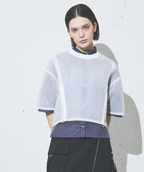 シアーメッシュジッププルオーバー ■デザイン ダンボールニットのような弾力性のある肉感が特徴のメッシュプルオーバー。 素材の特性を活かし、フォルムが際立つコクーンシルエットに仕立てたデザイン。 ハリ感もあるのでさらっとして肌離れも良く春夏シーズンにピッタリな一枚。 フロントのファスナーはスリットのように開けることでアレンジが可能。 シンプルながらも一枚で存在感のあるアイテム。 ■素材 ダブルラッセルのダンボール素材を使用。 ハリ感と柔らかさを兼ね備え、しっかりとした質感がありながらも、シアーな質感による軽やかさが特徴。 ■コーディネート Tシャツ感覚でさらっと着こなせる一枚。 モードな印象のシルエットが引き立ち、シンプルなボトムスと合わせるだけで洗練されたスタイリングに。 一枚着としてはもちろん、トレンドのレイヤードスタイルのインナーにも活躍するアイテム。 ------------------------------------- 透け感:あり 裏地:なし 伸縮性:あり 光沢感:ややあり 生地の厚さ:薄地 ------------------------------------- ※商品画像は撮影時の光や角度により、実物の色味と異なって見える場合がございます。