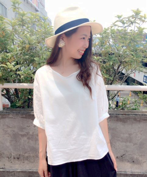 Discoat(ディスコート) タック入りのふんわりとした5分袖にペイズリー刺繍を施した、ドロップショルダーのコットンブラウス。身頃はボートネック×ボックスシルエットのプルオーバーデザインでシンプルに仕上げられているため、きれいめな装いはもちろん、カジュアルなコーディネートとも好相性です。