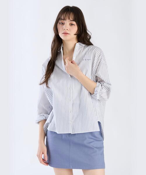 細ピッチのストライプ柄が爽やかな印象を与えるバンドカラーシャツです。 程よくゆとりのあるシルエットで、リラックス感のある着こなしが叶います。 胸元のワンポイント刺繍がさりげないアクセントに。 原産国:ベトナム 組成:綿100% 実寸情報 36(S) 肩幅:55.5cm/バスト:126cm/袖丈:43.5cm/身丈:65.5cm 38(M) 肩幅:57cm/バスト:128cm/袖丈:45cm/身丈:68.5cm 40(L) 肩幅:60cm/バスト:132cm/袖丈:47cm/身丈:70.5cm モデル身長/171cm、着用サイズ/38